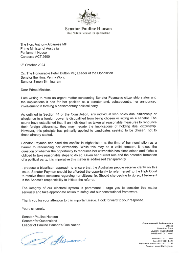 Today, I have written to the Prime Minister concerning the citizenship status of Senator Payman.