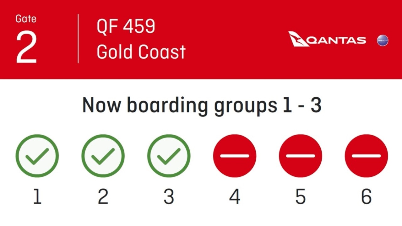 From Monday at Brisbane Airport, passengers on the flying kangaroo will get a boarding group number of one to six on their ticket.