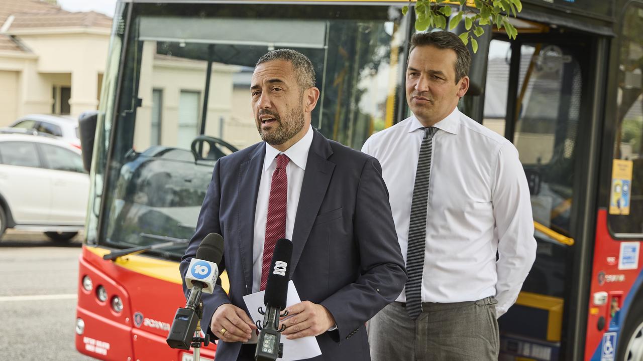 Transport Minister Tom Koutsantonis and Education Minister Blair Boyer announcing new buses for schools last week. Picture: Matt Loxton
