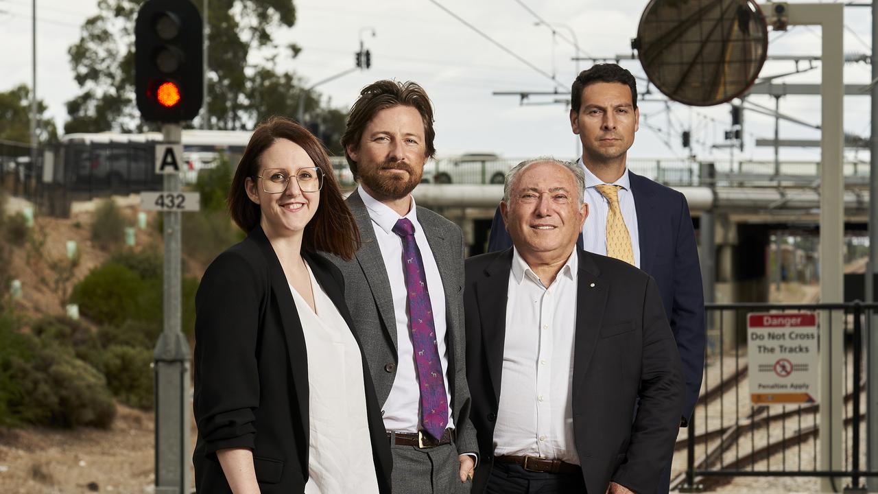 Elena Garcia, with engineers Edwin Michell, Luigi Rossi and Jesus Rodriguez from Talgo at the Adelaide Showground stop in Wayville in 2022. Picture: Matt Loxton