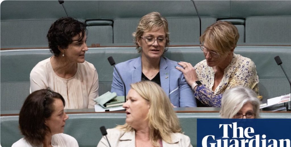 This ridiculous image suggests a tearful Zali Steggall requiring comfort after being abused by male Coalition MPs.