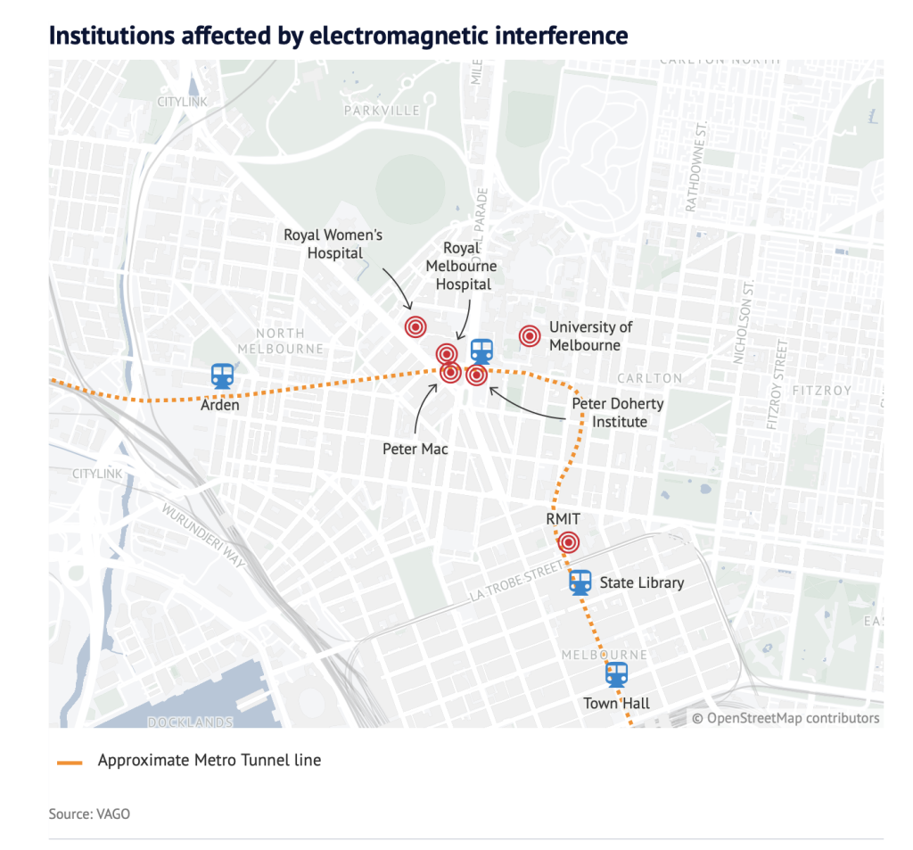 But along with these issues, which the government argues are part of any infrastructure project of this scale, unresolved problems remain with cancer treatment equipment at the Peter MacCallum Cancer Centre in Parkville, and with sensitive microscopes at RMIT in the CBD.