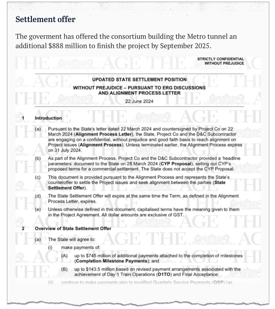 The legal document, with each page marked “strictly confidential”, is dated June 22 this year. That was two days after an auditor-general’s report tabled in state parliament found the Metro project was running over budget and behind its originally contracted opening date of September 2024.