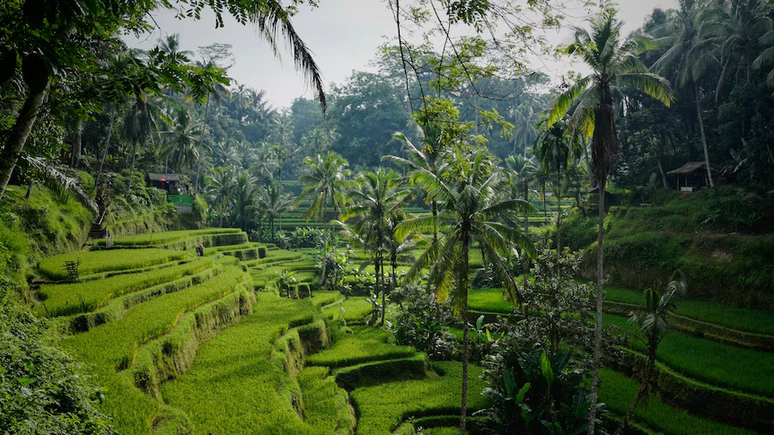We cross a wide river into Central Java’s green interior, a landscape of lush green woodland and tiered flooded rice fields that step uniformly down to river ravines crowded with palms, bamboo and coconut trees. Little tiled-roof cottages sit amid plentiful market garden plots.