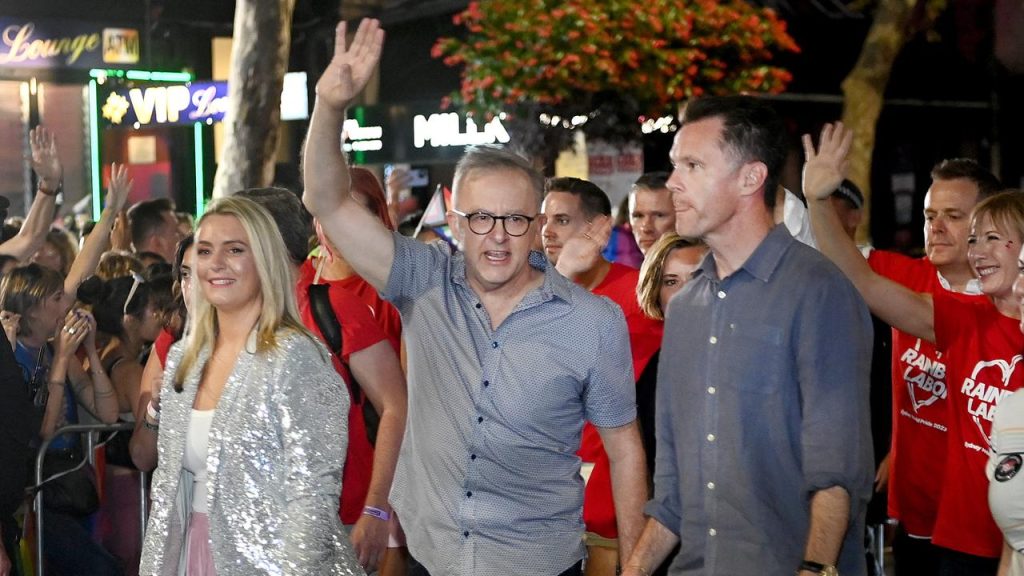 Anthony Albanese, with fiancee Jodie Haydon and NSW Premier Chris Minns, was the first prime minister to take part in the Mardi Gras parade in Sydney in 2023. Picture: NewsWire / Jeremy Piper