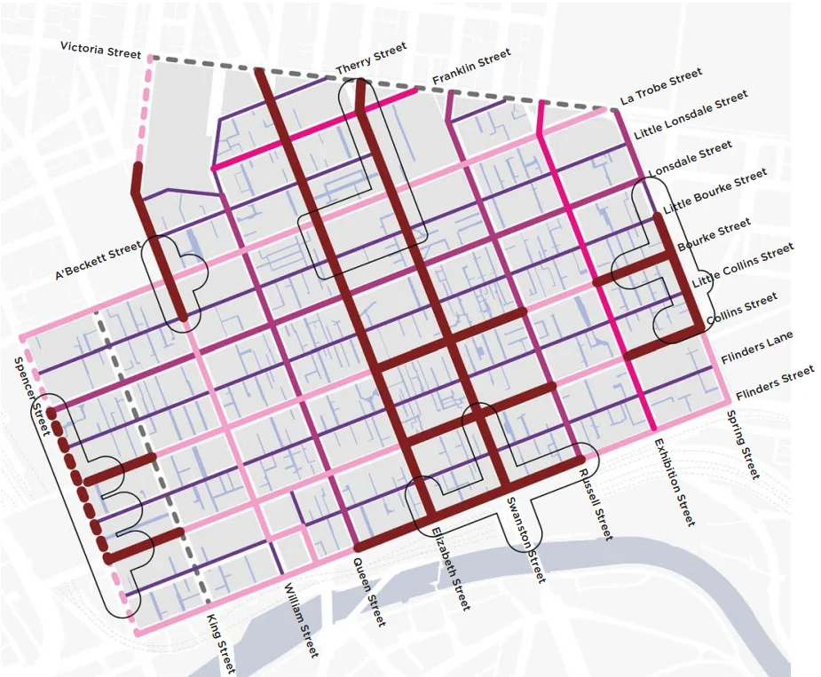The draft street plan categorises all CBD streets into one of: city streets with trams, city streets with buses, city streets with bikes, Little streets, and laneways.