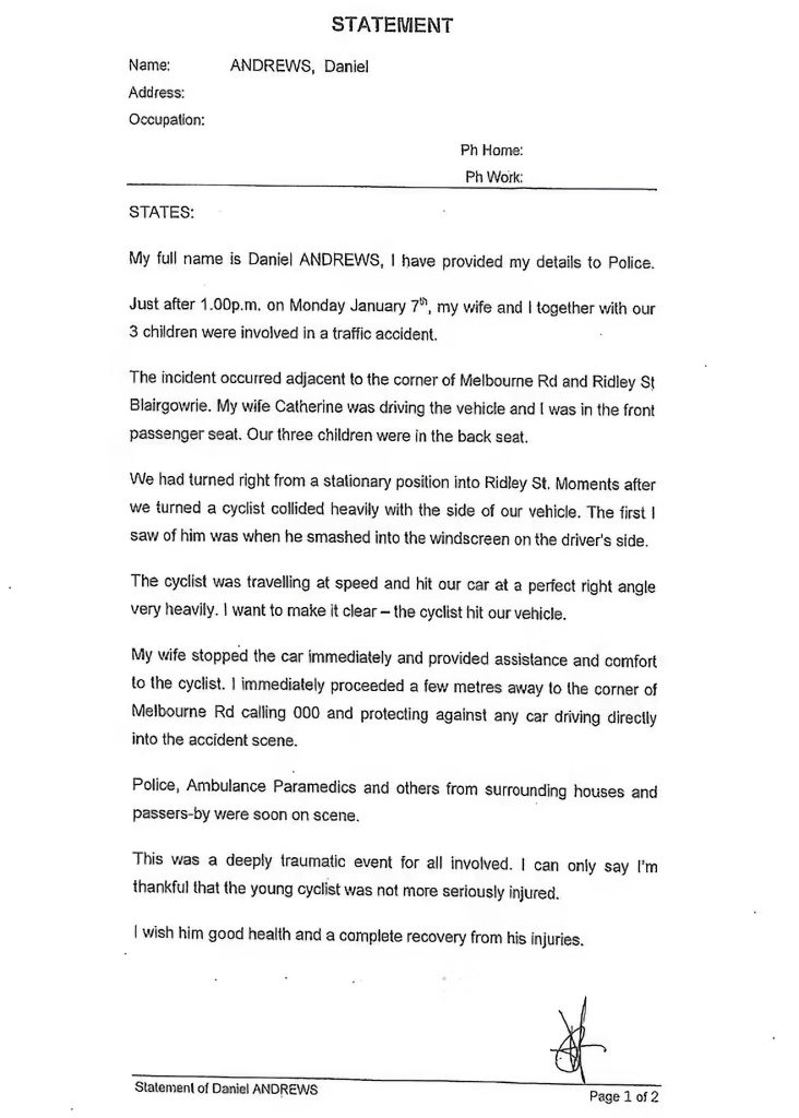 READ THESE EXCERPTS from Daniel Andrews signed Police Statement , 05, Feb 2013 … 29 days after his SUV crashed into 15 year old Ryan Meuleman. Daniel Andrews …“The first I saw of him (Ryan) was when he smashed into the windscreen on the driver’s side.”