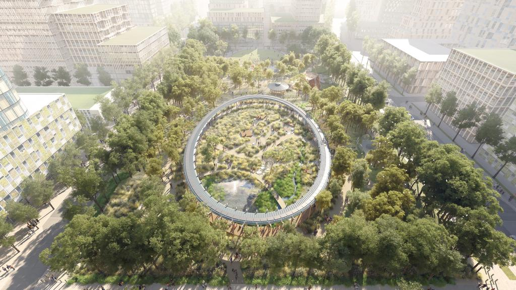 More than 550 mature trees and 70,000 species of native plants will create a green oasis with public art, active learning, and gathering spaces. The design also features a multi-generational interwoven play area and a Gathering Green for major community events.