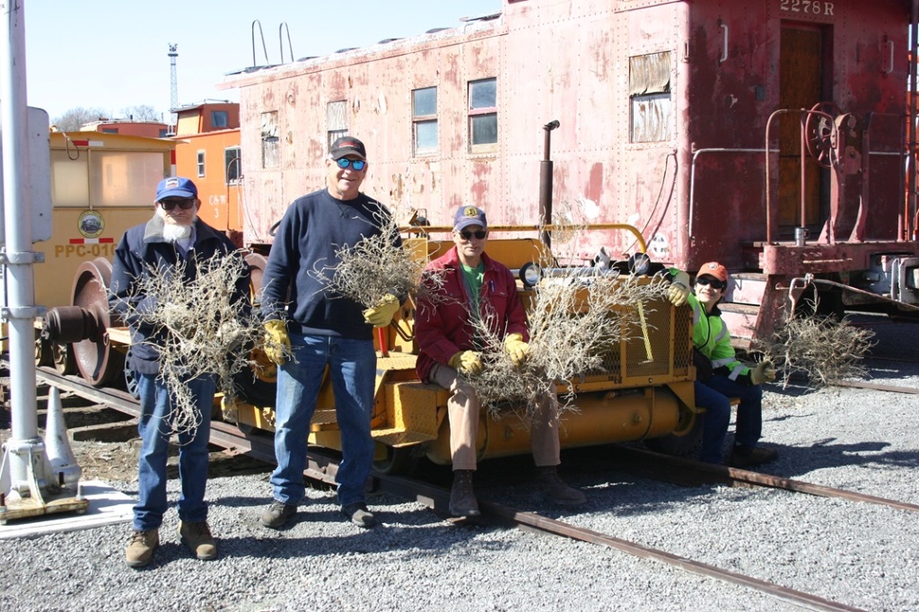 On Saturday, March 9, volunteers Dwight Maxey, Colin Mellin, Bruce Davis, Chris Pollard, Dannis Hudson, Polly Cotton and Paul Brown worked on several projects, the first being one of the most important jobs at the Museum, cleaning up blown in tumbleweeds. While it doesn’t seem important, it greatly improves the looks of the Museum grounds. While that work was being done, we were also charging the locomotive batteries in hope that we can start Engine 104 come the end of the month for the Easter event. When the weed cleanup was completed, we did some work on our Hi-Rail truck, and then took a lunch break.