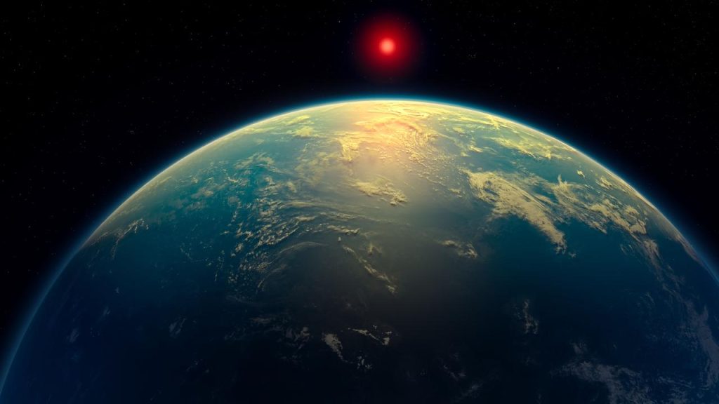 An artist’s conception of a Hycean exoplanet like K2-18b orbiting a red dwarf star.