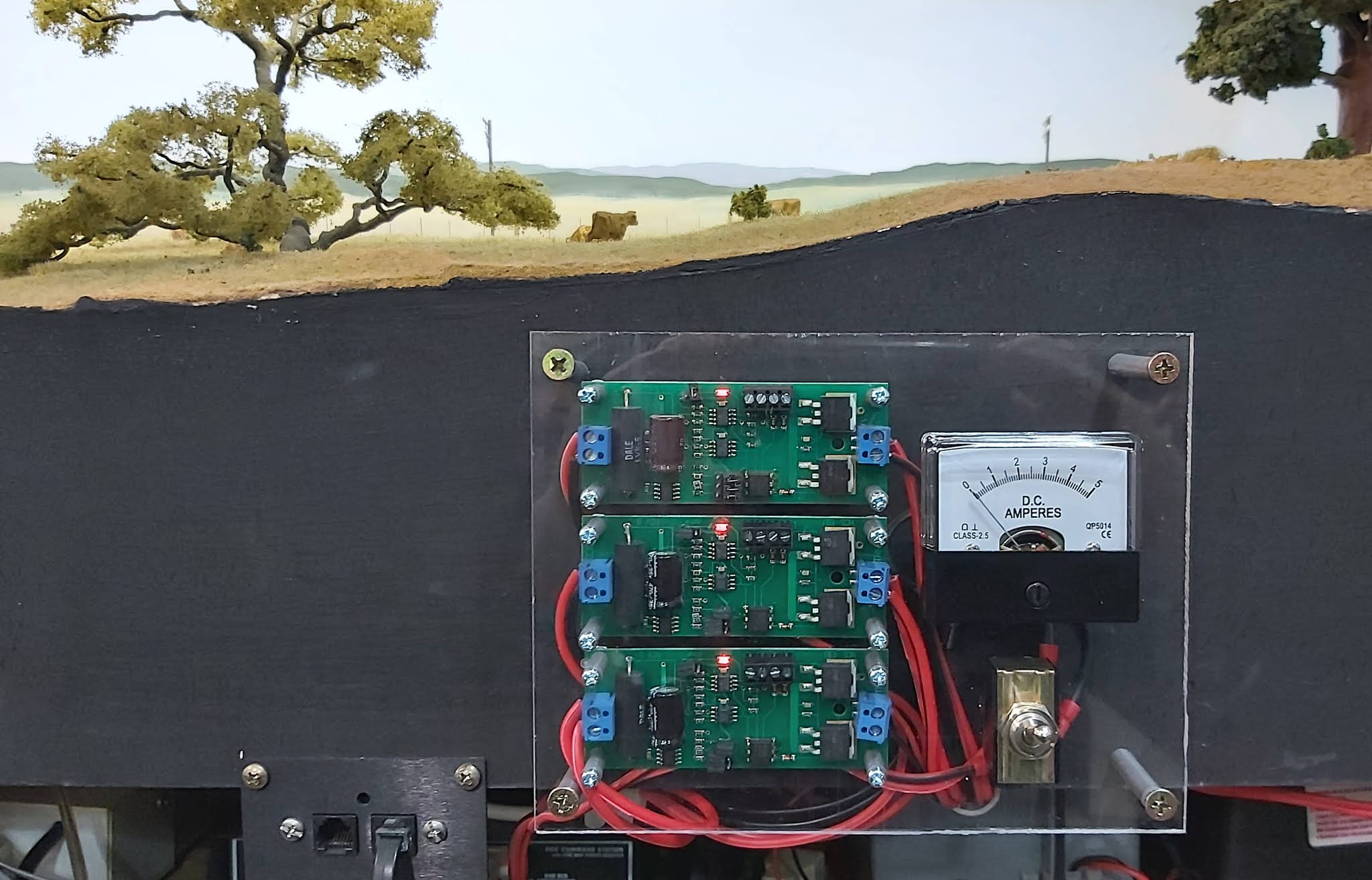 In the photo above a toggle switch and a 5 Amp ammeter can be seen. This measures the total amperage drawn by the layout when operating. The toggle switch is to cut the ammeter out of the power to the track when not reading as it uses some voltage. It is turned on when needed to check the current draw.