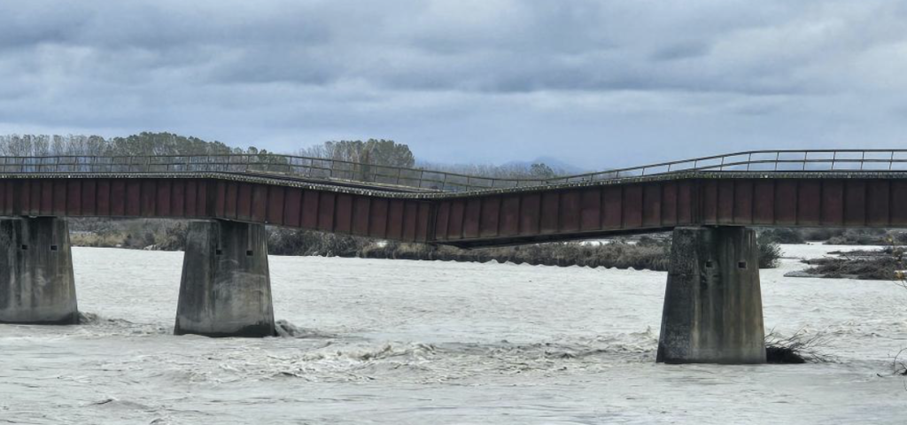 Flood waters have washed away one of the piers holding up the rail bridge over the Rangitata River resulting in the steel bridge spans sagging. Photo: Connor Haley