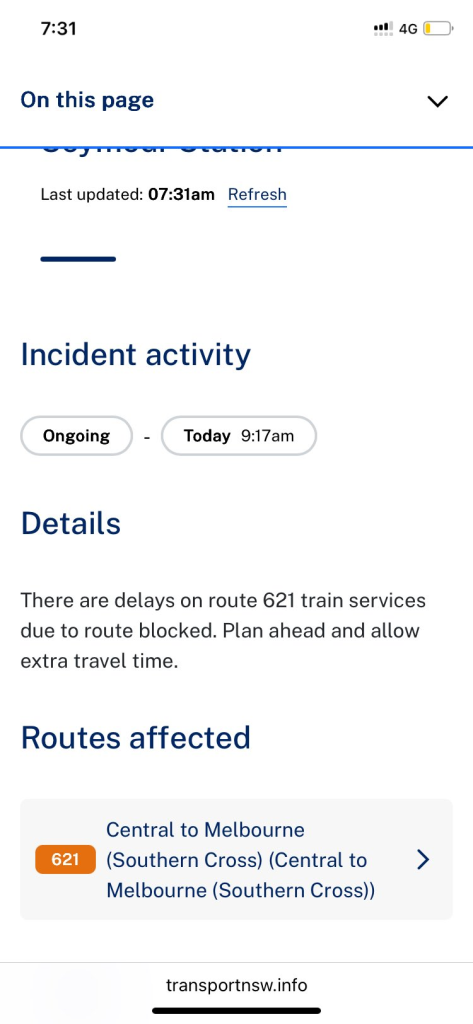 It is also believed the same incident caused delays to the XPT service between Sydney and Melbourne withthe interstate passenger service being held at Seymour for up to 1 hour. Given the networks (V/Line and ARTC Interstate) and separated from each other it is unclear why yet another V/Line incident would or should affect traffic on the Albury and Sydney line.