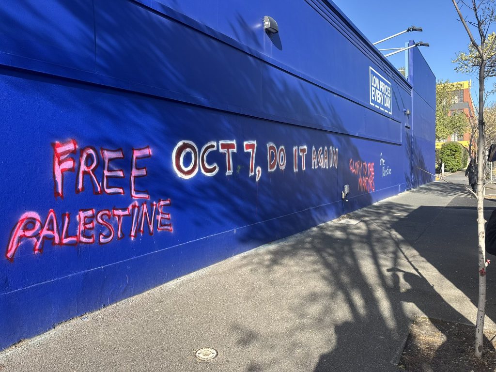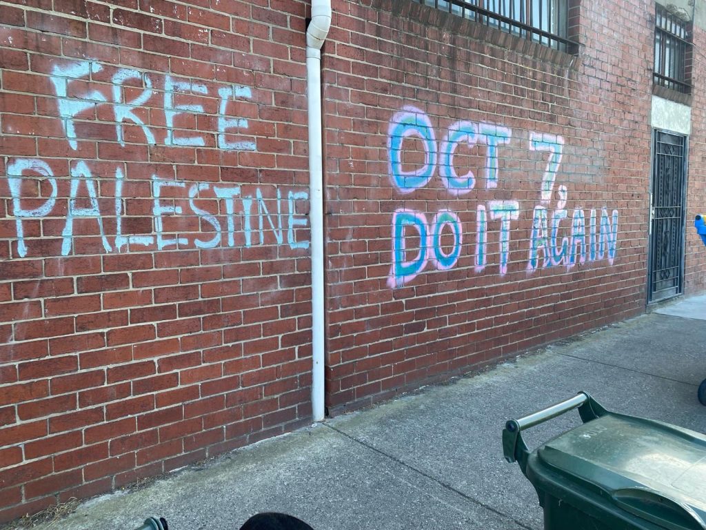 This would be confronting for many and should be removed as soon as possible although it appears the graffiti is on private buildings and structures.