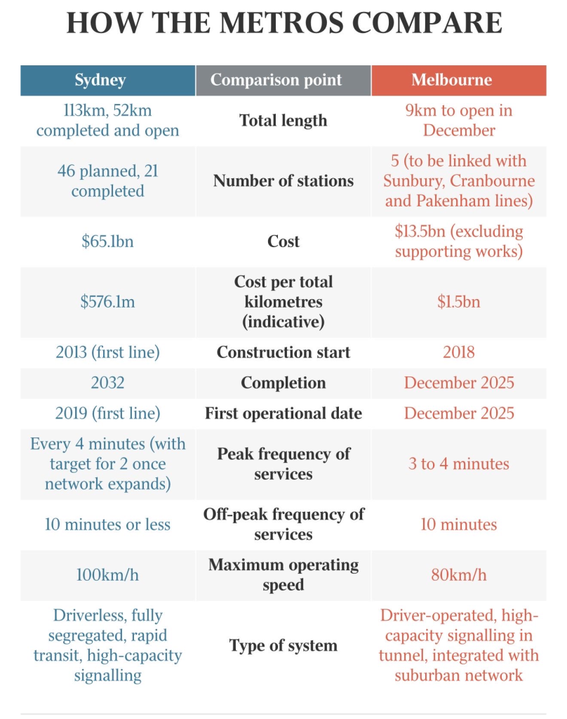 The Australian Newspaper has just completed a comparison of Metro Systems between Melbourne and Sydney. One stark statistic clearly not defendable is the extraordinary price per kilometre built between the two capital cities. How could it possibly be that Victoria is 3 times more expensive than Western Australia or NSW?