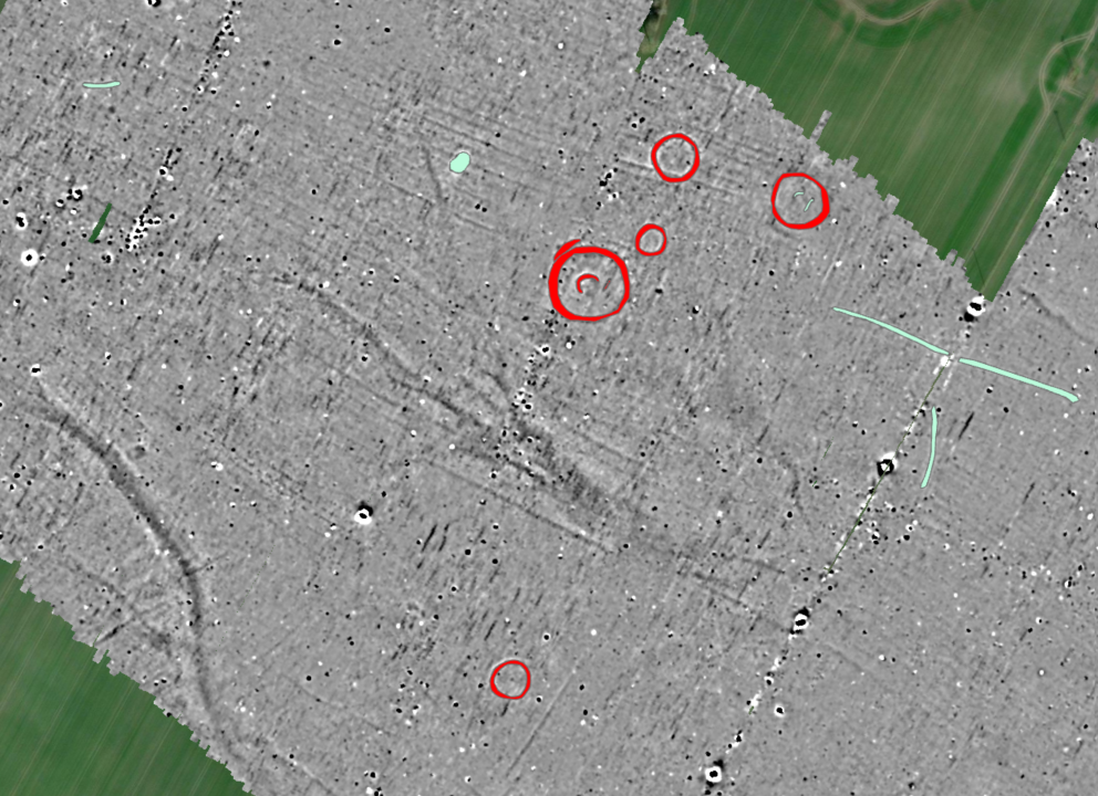 Bronze Age cemetery barrows are earthen mounds covering prehistoric burials, that provide extraordinary insight into how our ancestors lived and died. This barrow cemetery represents a significant Bronze Age site with burial mounds varying from 20 to 55 metres in diameter. Advanced geophysical surveys have revealed potential burial pits within some of the ring ditches, while three barrows remain visible as earthwork mounds despite centuries of agricultural activity.