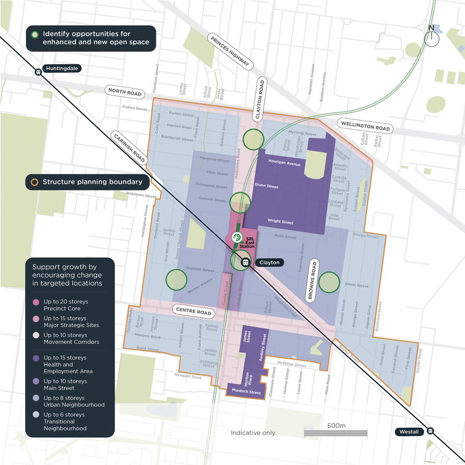 Lower height limits will apply above the five other stations. Towers would be capped at 25 storeys at the centre of Monash and Glen Waverley’s SRL precincts. Clayton and Burwood would top out at 20 storeys and Cheltenham at 18. Some areas designed as “major strategic sites” would also permit heights between 15 and 18 storeys.