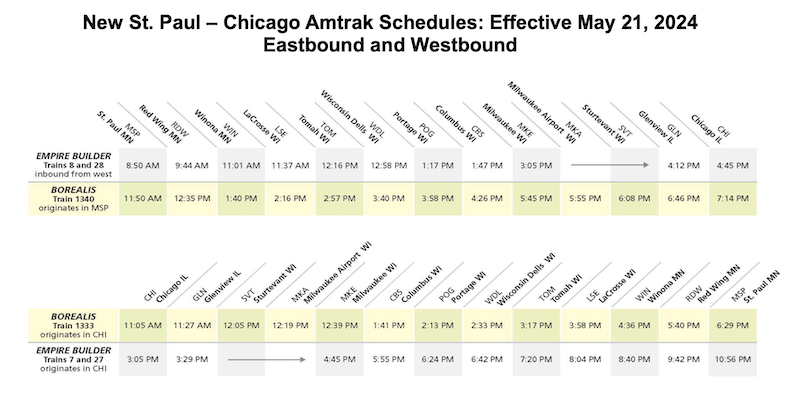 The eastbound Borealis, No. 1340, will depart St. Paul, at 11:50 a.m., about three hours after the Builder does. The westbound, No. 1333, will depart Chicago Union Station at 11:05 a.m., about four hours before train No. 7. The new train will serve all stops that the Empire Builder and Hiawatha trains do.