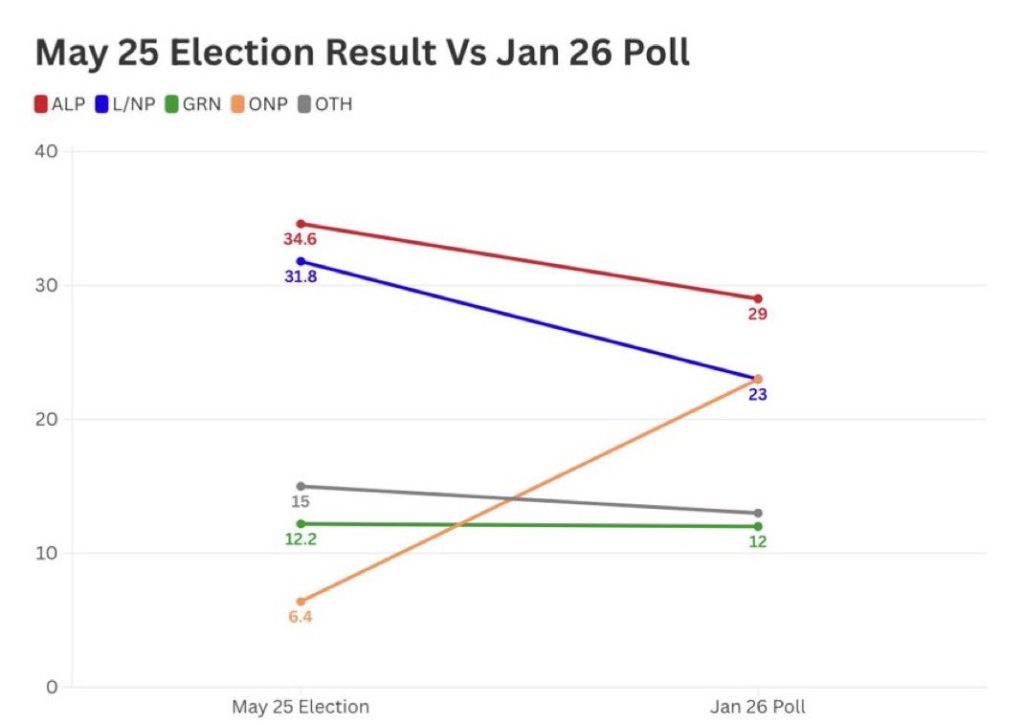 The DemosAU survey from January 5-6 captured One Nation’s +16.6 swing, drawing voters from both Labor and the Coalition amid frustration over housing, power prices, immigration, and net zero policies.