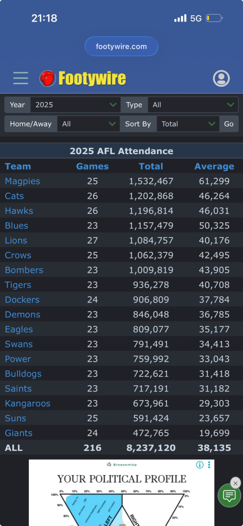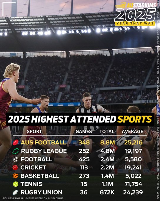 Top attended Sports in Australia for 2025 Posted on January 11, 2026January 11, 2026 by Bardy Bigglesworth A look at the top attended sports during 2025. Based on every sports event listed on Austadiums – see website for more info.