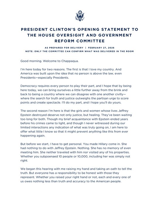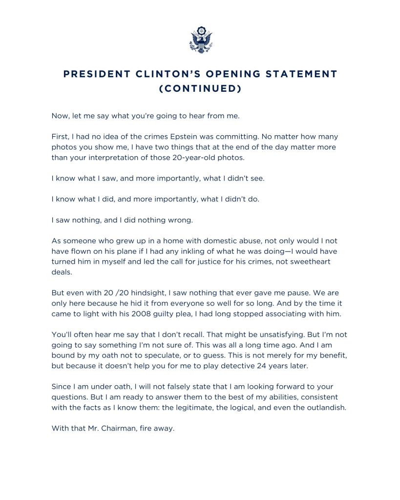 Bill Clinton testified under oath before the Republican-led House Oversight Committee in Chappaqua, New York, stating he saw nothing suspicious with Epstein and cut ties after the 2008 guilty plea.