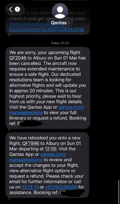 Qantas said customers received this SMS informing them of the cancellation