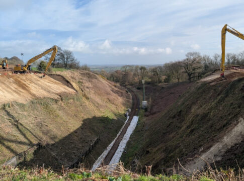 Engineers worked around the clock to strengthen the embankments between Chetnole and Maiden Newton around the Evershot Tunnel. The team cut through soil and rock to stabilise the slope by using soil nails and netting.