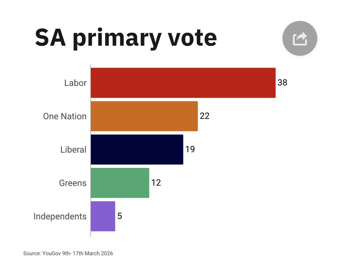 A YouGov poll from March 9-17 captured One Nation at 22% primary vote, topping Liberals at 19%, while Labor holds steady at 38% and leads 59-41 on two-party preferred.