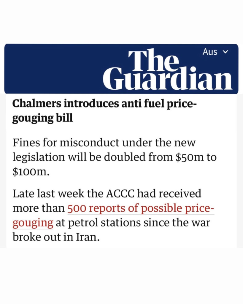 Treasurer Jim Chalmers doubled fines for price gouging to $100 million, with over 500 reports to regulators, while officials monitor stockpiles at 36 days for petrol and 34 for diesel.