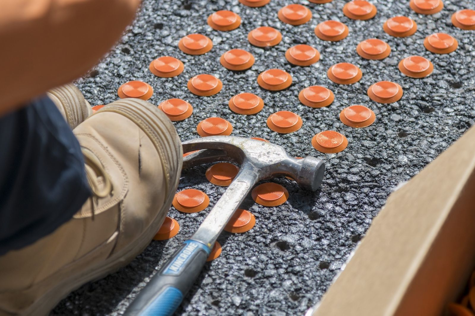 The important tactiles create a textured surface to provide vital orientation and safety cues. Each individual tactile is hammered into a hole drilled by a precision rig, with the tactiles shaped to be easily detectable by canes or underfoot, but also flat enough to ensure they are not a tripping hazard.