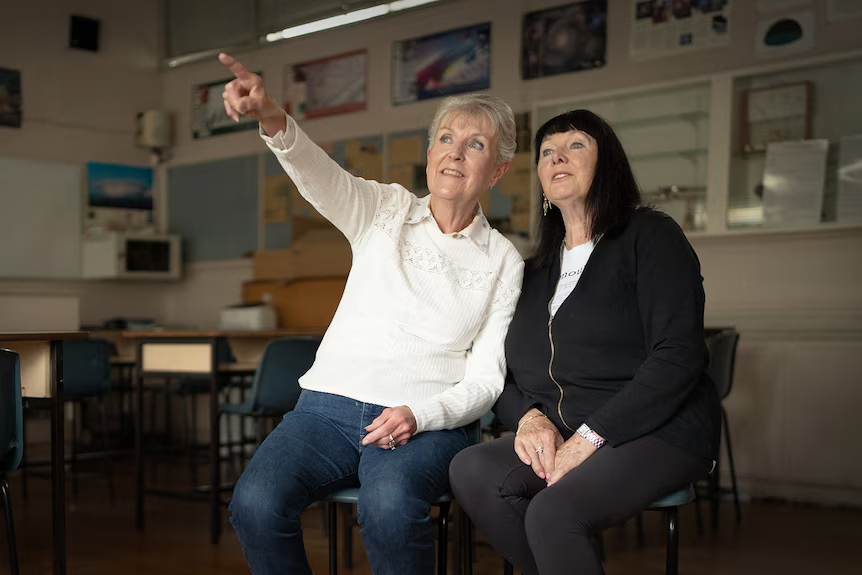 Self-confessed “naughty” student Terry Peck recalls how she and others vaulted the school fence to race after the “saucer-shaped” craft as it moved to a nearby area of bush known as the Grange.