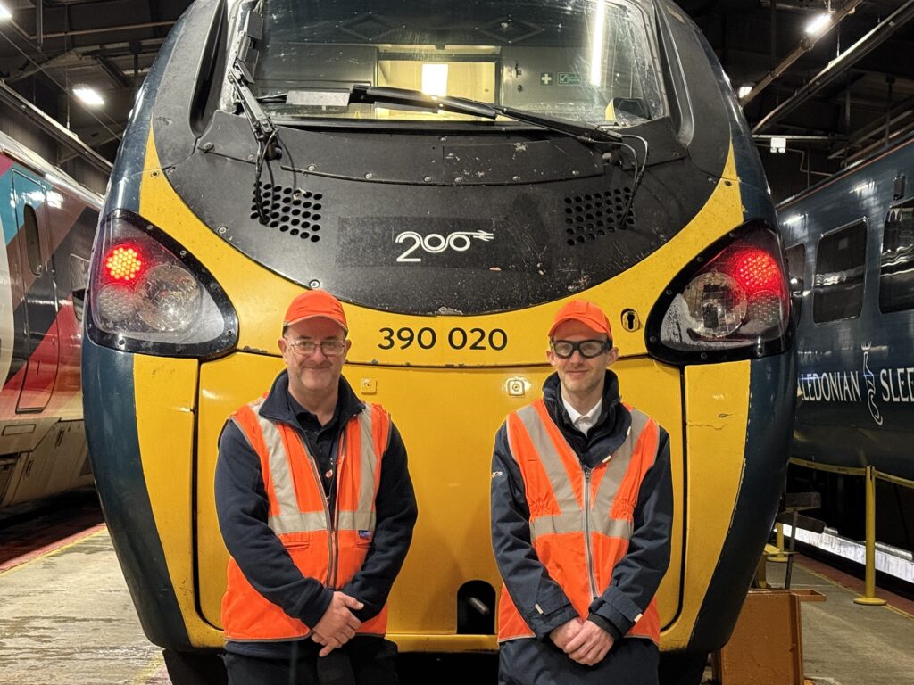 Tim Barton, train presentation manager at Alstom, and Jason Stuart, cleaning manager at OCS, have made use of mobile staging at the depot in Polmadie that – with overhead isolation – enables cleaners to get closer access to windscreens on the Class 390s.