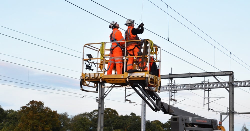 The power cables carry 25,000 volts AC and Torrent Trackside supply a range of earth poles and live line testers to ensure the safety of the engineers. The electricity is transferred to the train via a cantilevered contact wire that pushes against a sprung pantograph attached to the train. The wire is staggered in a zig zag path to avoid wearing down a groove in the pantograph.