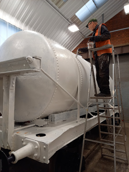 There were many comments (the post title being one of them) about the brightness of the fresh white gloss that was going on GW Tank Wagon 43930. Maurice did as much as he could – the Cotswold side and sole bar – but was limited because we have run out of undercoat white, so the Malvern side had to be left. We are putting on two undercoats to give a good depth of paint, hence running out of undercoat!