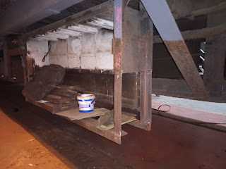The seaward side battery box continues and has had its framework repairs now completed. Repairs and rebuilding of the box itself is also moving forwards steadily.