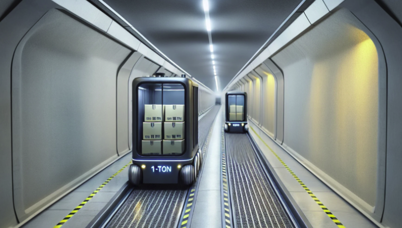 One possibility is to use massive conveyor belts to cover the 500-km (310-mile) distance between the two cities, running alongside the highway or potentially through tunnels underneath the road. Alternatively, the infrastructure could simply provide flat lanes or tunnels, and the pallets could be shifted by automated electric carts.