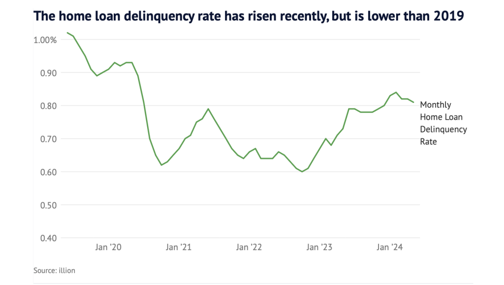 In May, 0.81 per cent of home borrowers were at least 30 days behind on their repayments, illion found, and the figure has hovered above 0.8 per cent this year. It has ticked up since 2022 when fewer than 0.7 per cent of borrowers were running late and many homeowners still had low fixed-rate mortgage deals, but remains lower than in 2019.